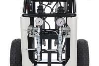 Установка 4Р100 самостоятельно всасывает компоненты из любой тары, подогревает их в проточных нагревателях и подает к пистолету распылителю по обогреваемым РВД. Установка собрана на прочной сварной раме с колесами. В установке установлено фиксированное соотношение компонентов «А» к «Б» - 1:1 по объему.